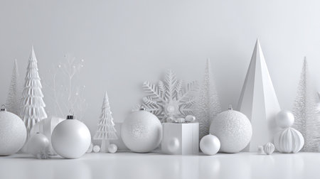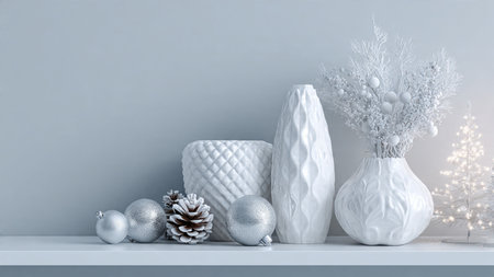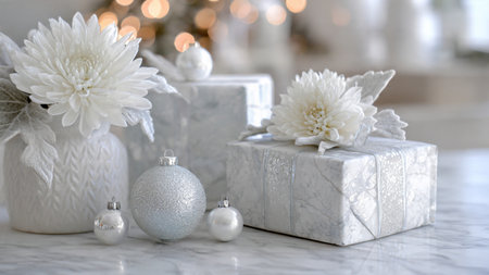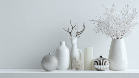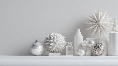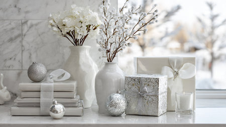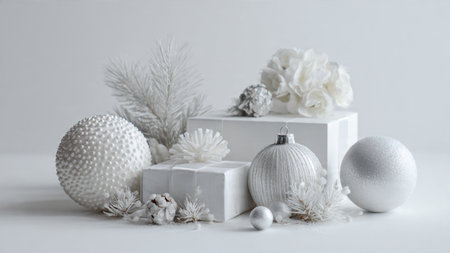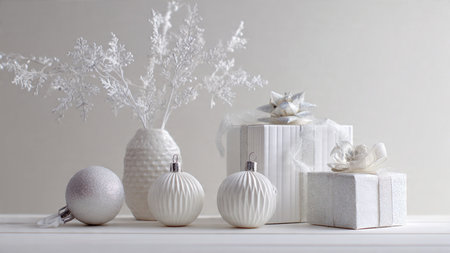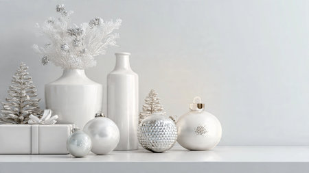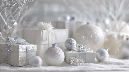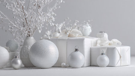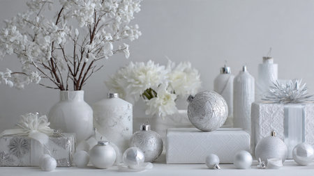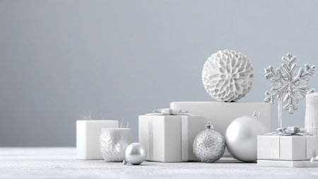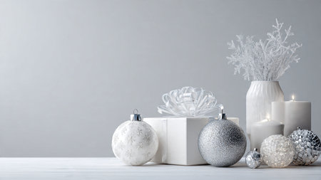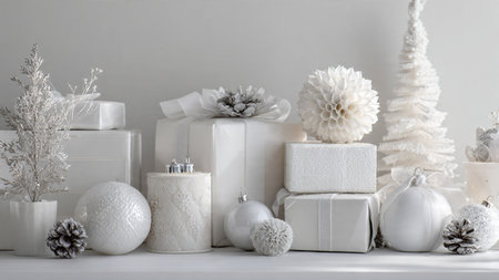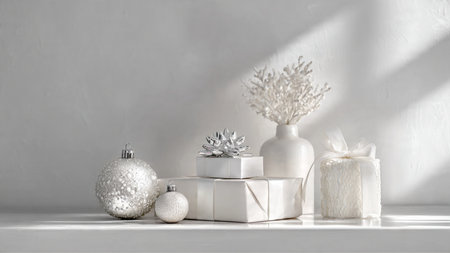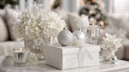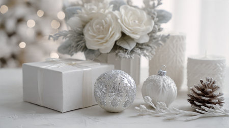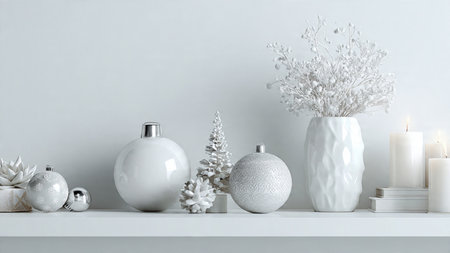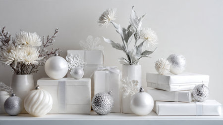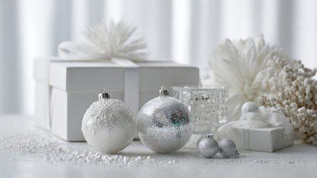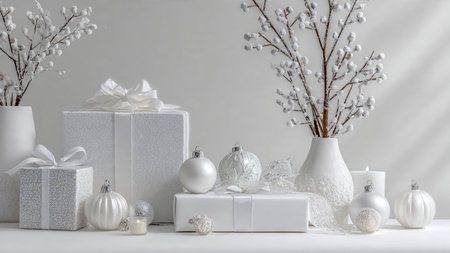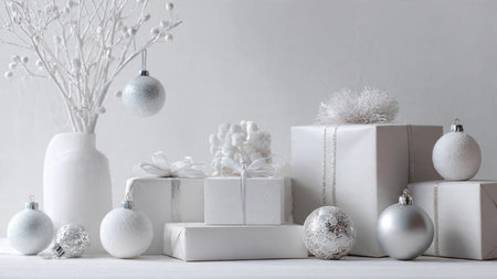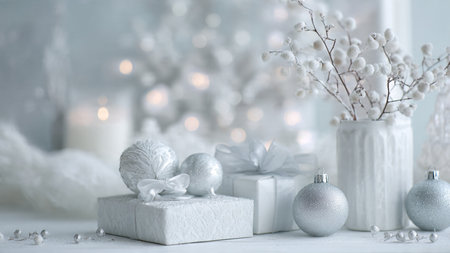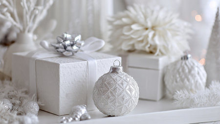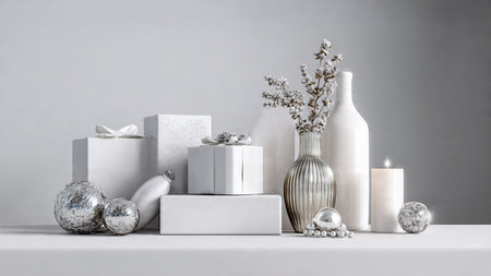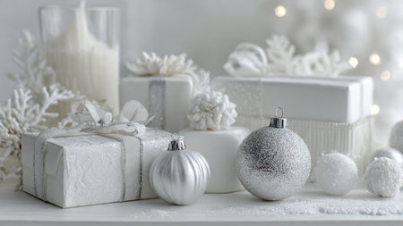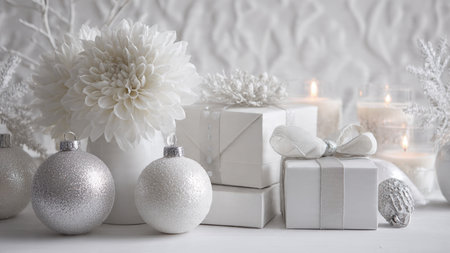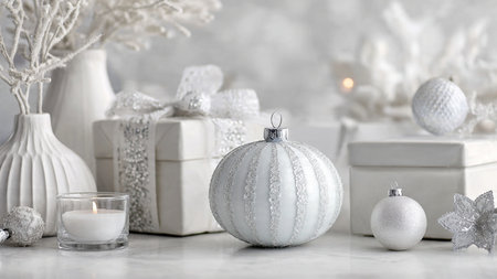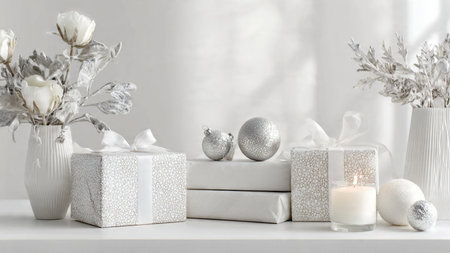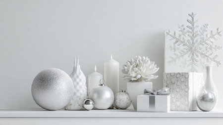 Christmas decoration with white and silver ornaments, candles and gift boxes on a white shelf