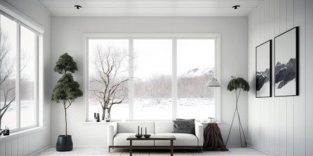 White living room with sofa and summer landscape in window. Scandinavian interior design.