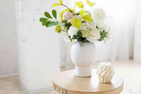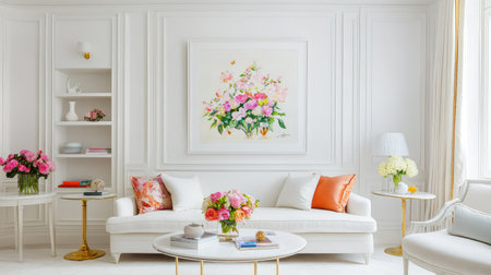 Bright white and green flowers fill a clear vase on a wooden tray. The modern interior features a colorful abstract painting and soft furnishings, creating a welcoming atmosphere.