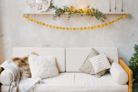 A light Scandinavian-style sofa with pillows in the living room, decorated for Christmas and New Year. A garland of dried oranges or lemons stretched under a shelf on the wall