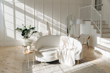 Stylish white living room with white leather sofa, floor lamp, full length oval mirror and wooden stairs leading to second floor. Staircase. Potted plant at home. Sunbeams in the interior. Nobody