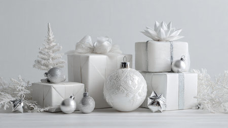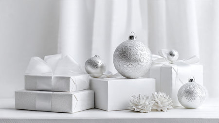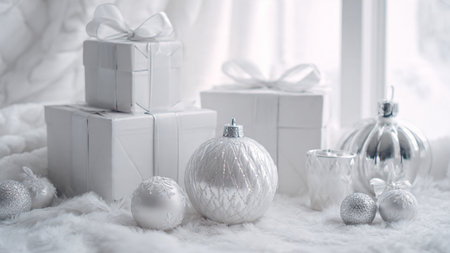 White gift boxes with silver christmas balls and ribbons on white windowsill