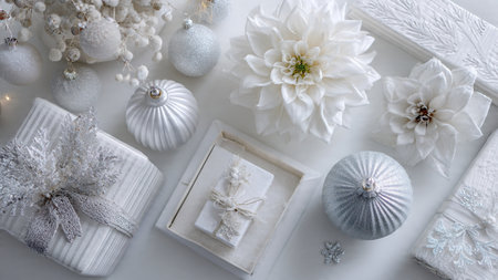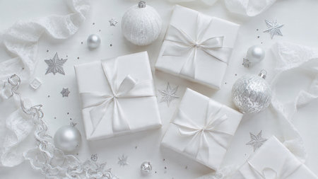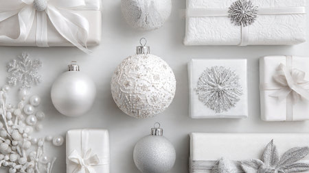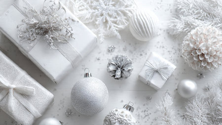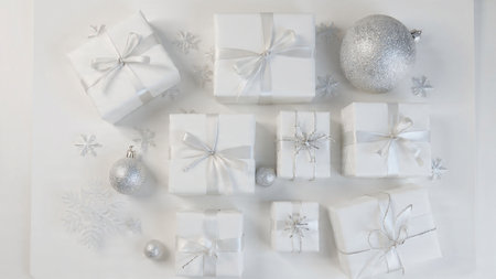 Christmas or New Year background. White gift boxes, silver balls, snowflakes on white background. Flat lay, top view