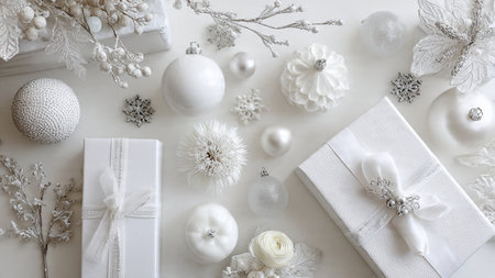 Christmas composition. White christmas decorations on white background. Flat lay, top view, copy space