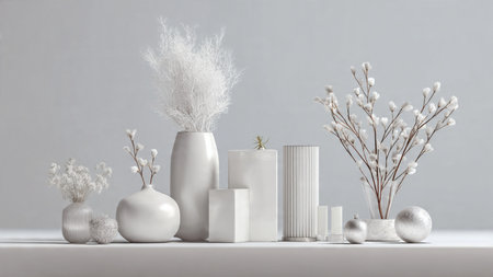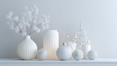 Christmas or New Year decoration with white vase, candles, balls and branches on white shelf. 3d rendering