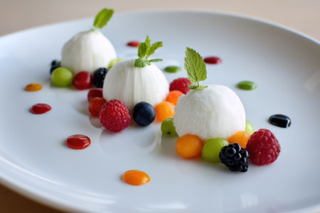 A beautiful arrangement of creamy desserts with raspberry and melon flavors is enhanced by colorful fruit garnishes, creating an elegant culinary display.