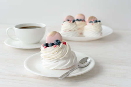 Still life with Pavlova meringue cake with fresh berries on white background.