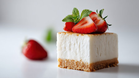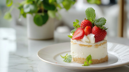 A beautifully presented slice of strawberry cheesecake, topped with fresh strawberries and mint leaves, sits elegantly on a marble table, capturing the essence of sweetness and freshness.