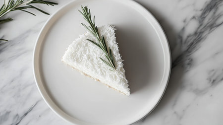 A beautifully presented slice of coconut cake on a white plate captures the essence of elegance and simplicity, enhanced by fresh rosemary garnish.