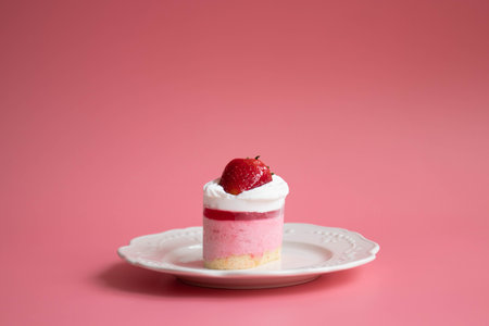 Minimalist arrangement featuring a single slice of strawberry shortcake topped with whipped cream and a fresh strawberry, served on a white plate against a white background