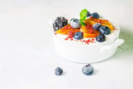 Healthy food, snacks or breakfast. Homemade Greek yogurt with blueberries, blackberries, persimmons and mint. On a concrete stone table. Selective focus