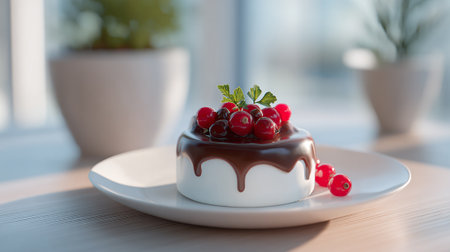 This is a delicious cake dessert with chocolate ganache, red berries and garnish, placed on a white plate. The backdrop has decorative plants.