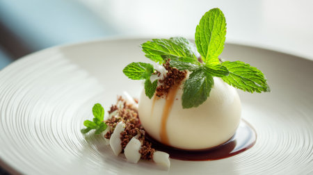 A beautifully crafted dessert featuring a creamy sphere drizzled with sauce, adorned with mint leaves and cocoa crumbs. Perfect for gourmet cuisine photography.