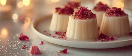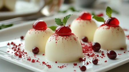 Elegant panna cotta desserts with red garnish