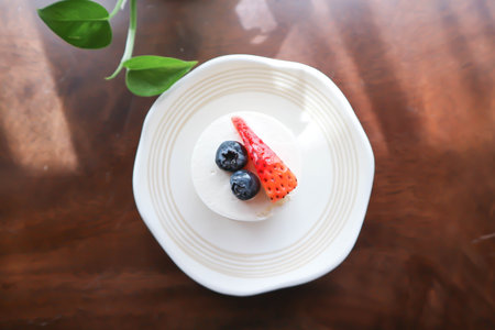 strawberry shortcake or strawberry cake with strawberry and blueberry topping and plant