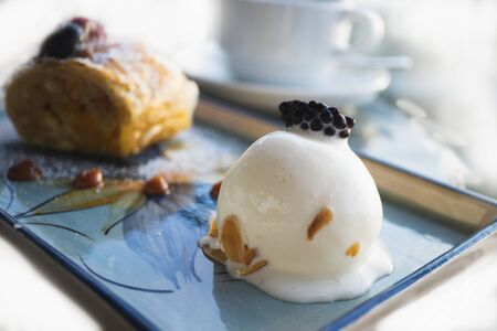 Appetizing ice cream ball with blackberry and apple strudel on a table in a cafe. Close-up of an aesthetically decorated delicious dessert. Blurred background