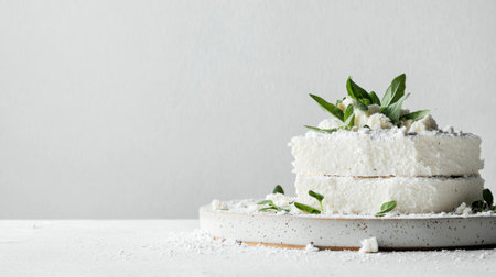 Two tiered white meringue cake decorated with fresh herbs and powdered sugar, sitting on a ceramic plate, offers a light and refreshing dessert option