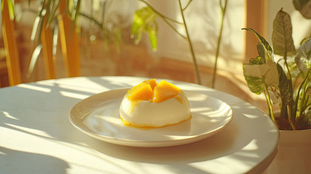 A delicate portion of mango yogurt on a white plate, with sunlight filtering through plants on the table.