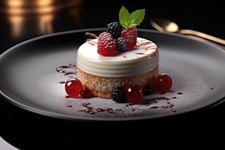 Homemade sweet desserts decorated with fruit on elegant plate at bakery. Elegant dessert decorated with berry fruit and sauce from fruit placed with separated background. Baked cake concept. AIG42.