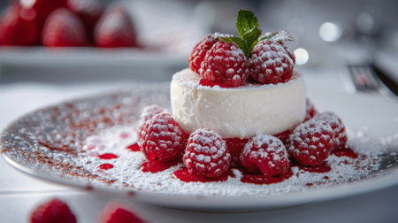 gourmet dessert presentation, a white plate showcases a raspberry dessert dusted with powdered sugar, a delectable and elegant treat, just waiting to be enjoyed