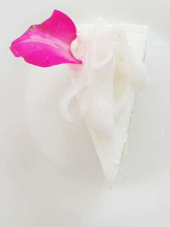 Slice of classic vanilla cheesecake New York with fresh raspberry and red currant on whte cakestand. Plain background.