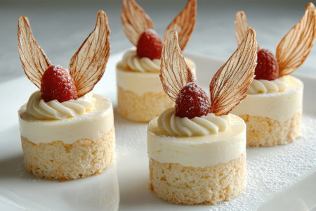 Delicious raspberry mousse cakes with delicate brown wings decoration