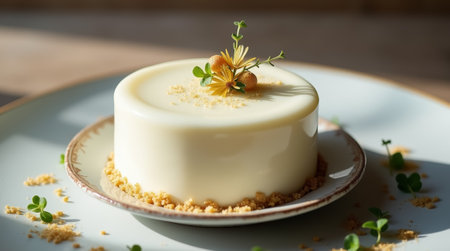 A beautifully crafted creamy dessert sits on a plate, adorned with small flowers and crunchy crumbs around the base, all illuminated by soft natural light.