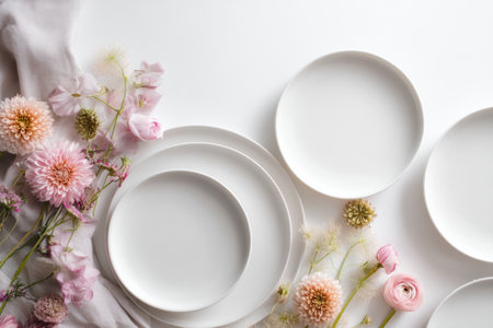 Clean plates and flowers on white background