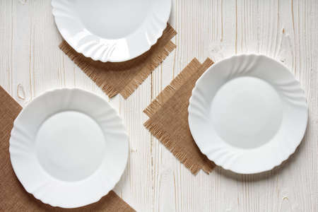 three empty plates on burlap kitchen napkins on a white wooden table, top view