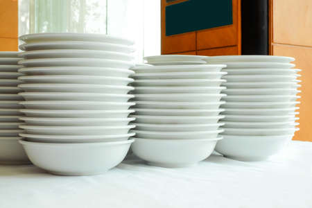Stack of many white plates on the table to prepare for catering buffet. tableware for lunch and dinner