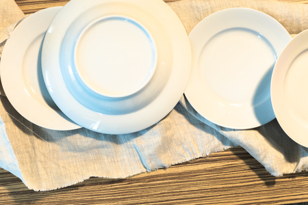 Empty white plates on wooden table