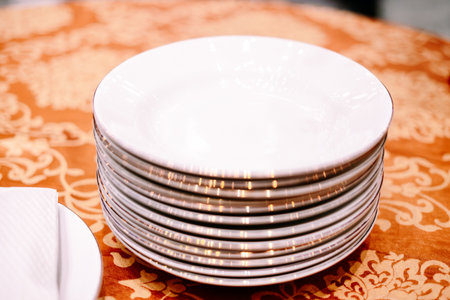 Closeup clean plates stack on a table ready for use
