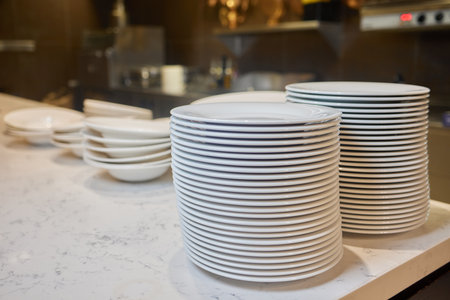 neatly arranged dinnerware ready for service, ceramic and porcelain plates organized for serving