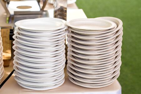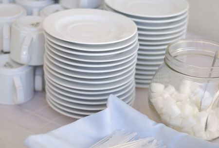 neatly arranged dinnerware ready for service, ceramic and porcelain plates organized for serving