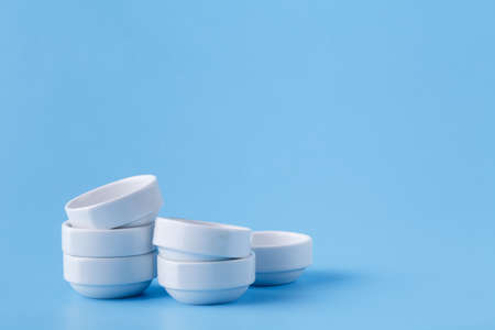 Stacks of clean and empty dipping bowls or ramekin with other dishware in the background