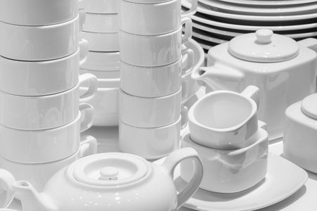 A collection of white dishes, including cups, bowls, and a teapot, are piled on top of each othe Service restaurant hotel
