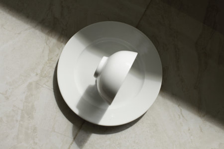 A clean white plates with gold rim are arranged on marble surface in natural light creating no dirty dishes on this national day