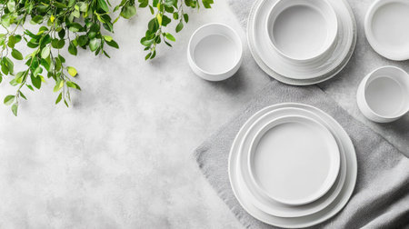 A minimalist dining setup featuring a collection of white plates and bowls arranged neatly on a soft linen. Greenery adds a touch of freshness and elegance.