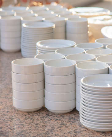 Close up stacks of white color ceramic coffee cup and dish ready for use in party room, catering service
