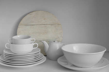 This image showcases a beautifully organized display of white dinnerware on a wooden shelf. Ideal for depicting modern kitchen decor and minimalist styling.