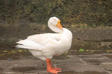 Beautiful white duck standing on the street of the old town.