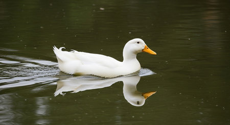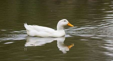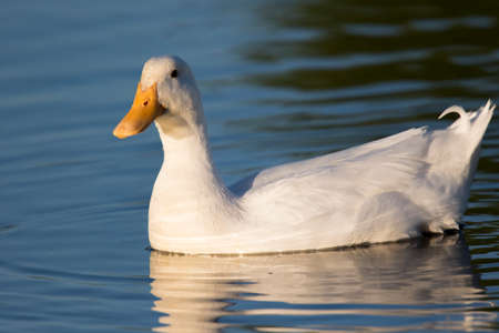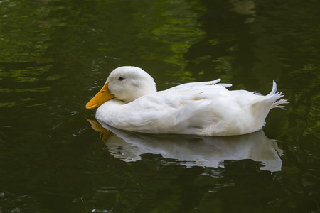 White duck swimming in a lake with reflection on the water surface.