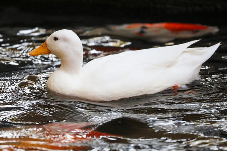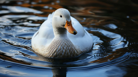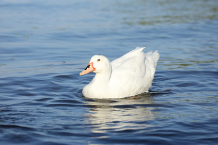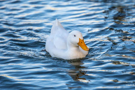 A white duck floats peacefully on the water. Carefree and calm concept