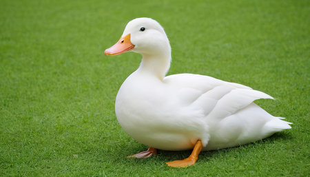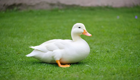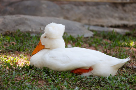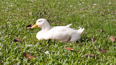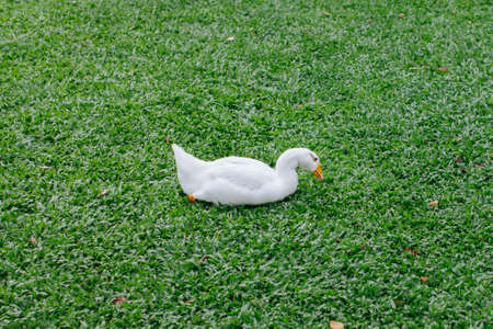 Beauty white duck sitting on the green grass