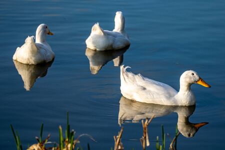 White pekin ducks swimming on still calm lake at sunset twilight