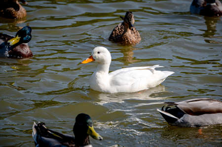 White duck swimming on the water surface of the lake in the park