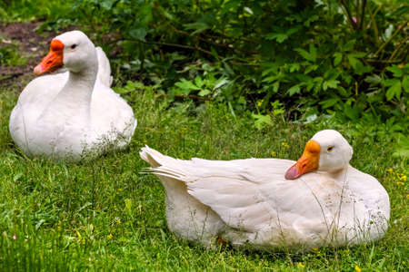 Two adult white geese on green grass in summer at day