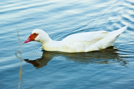 White duck swimming in a blue lake