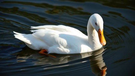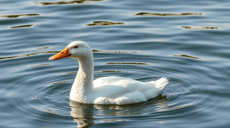 White duck gracefully swims on a tranquil lake reflecting the sunlight in the early morning hours