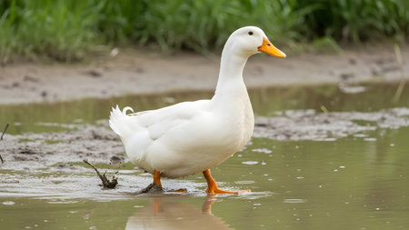 A clean white domestic duck walks through a shallow, muddy puddle. The duck has a bright orange beak and feet, contrasting with its white feathers and the brown muddy water.